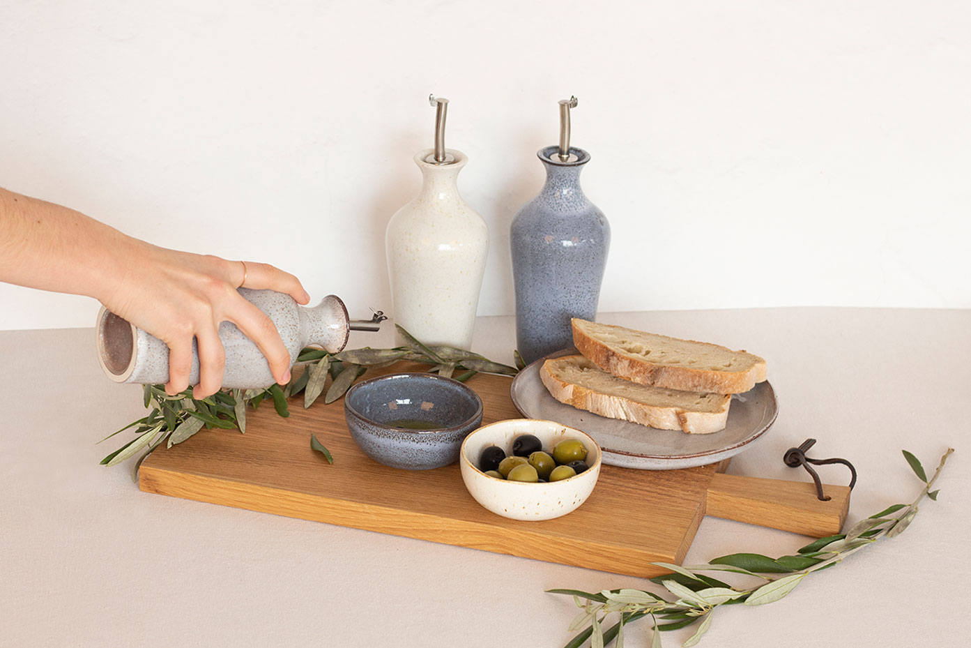 Conjunto composto por Garrafa de azeite, com dispensador em inox c/ tampa e Tigela de 10cm. Fabricados em cerâmica grés, acabamento à mão com vidrado reativo, confere individualidade a cada peça. Feito em Portugal.