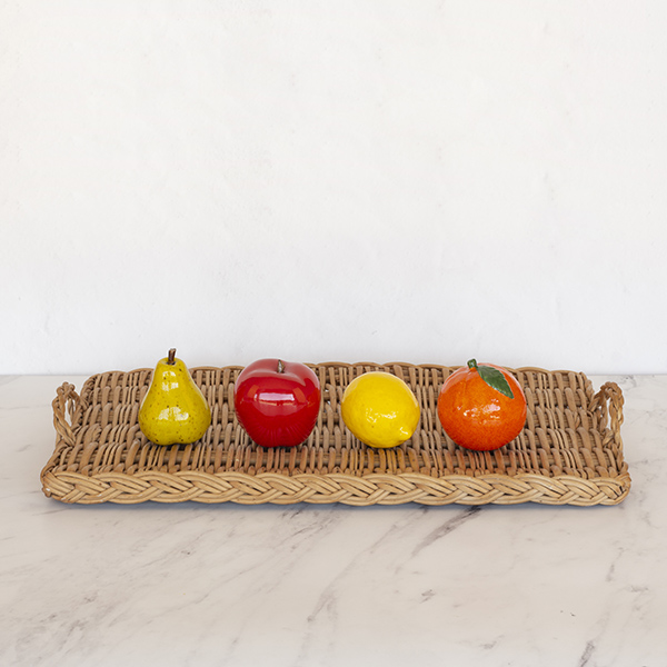 Dekoratives orangefarbenes, handbemaltes Steingut mit lebendigen Farben und grünem Blatt.