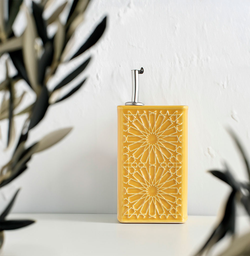 Olivenölflasche ALICATOS 500 ml, mit Edelstahldosierer mit Deckel. Es ist mit Reliefkacheln verziert und hat eine handveredelte reaktive Glasur.