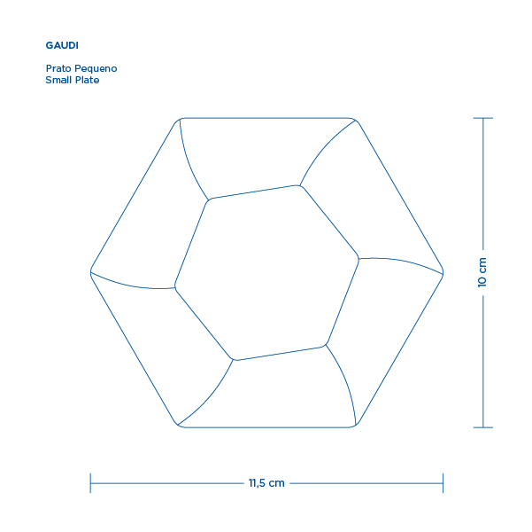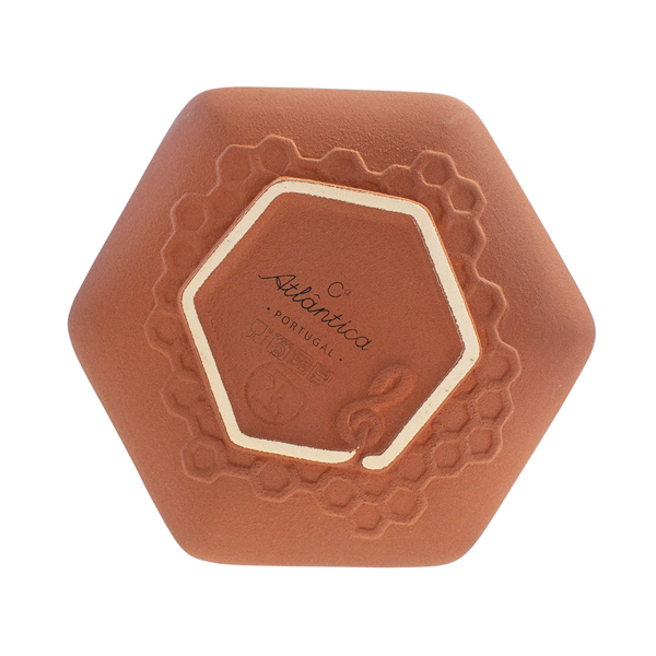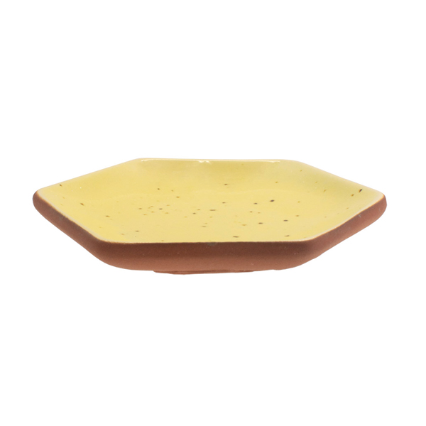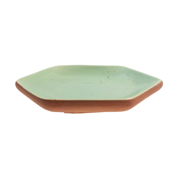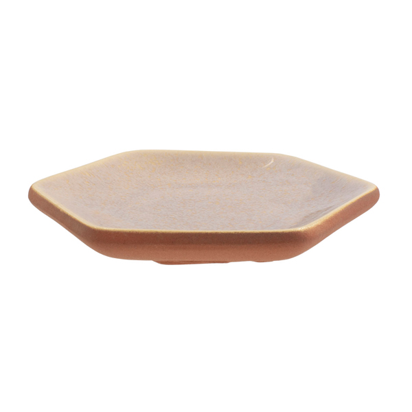 Kleine sechseckige Schale aus hochwertigem Feinsteinzeug, von Hand mit Terrakotta-Engobe verziert.