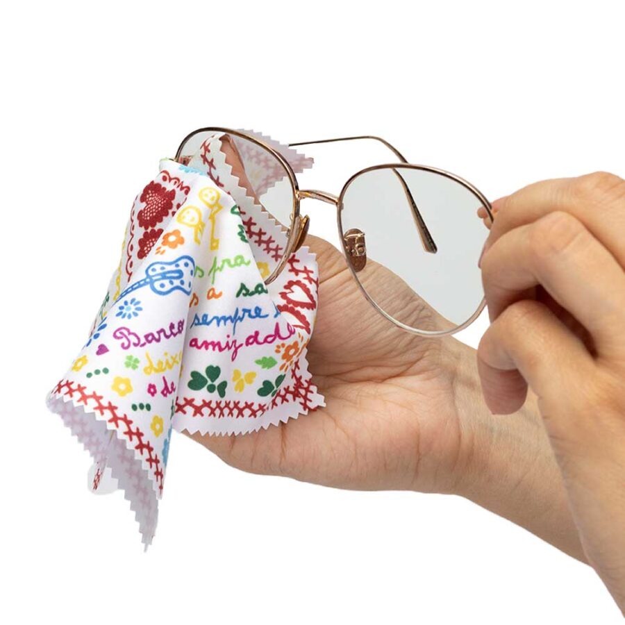 Mikrofasertuch NAMORADOS, 15x15cm, mit einem Muster, das vom Liebesbrief-Tuch oder Wunsch-Tuch inspiriert ist, Rückseite in Weiß. Ideal zum Reinigen von Bildschirmen, wie Smartphones, Smartwatches und Tablets, sowie von Brillen. Apropos Brillen, wussten Sie, dass wir das Brillenetui NAMORADOS haben, das perfekt zu diesem Tuch passt?