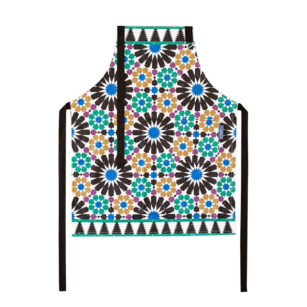 Die Inspiration für das Muster der Schürze ALICATOS stammt aus den arabischen Fliesen des südlichen Spaniens und Portugals, die ein reiches kulturelles und künstlerisches Erbe repräsentieren, das bis in die Perioden des maurischen Einflusses in der Region zurückreicht. Diese Stücke zeichnen sich durch komplexe geometrische Muster, florale Motive und islamische Kalligrafie aus, die prächtige Paläste, Moscheen und Wohnsitze schmücken.