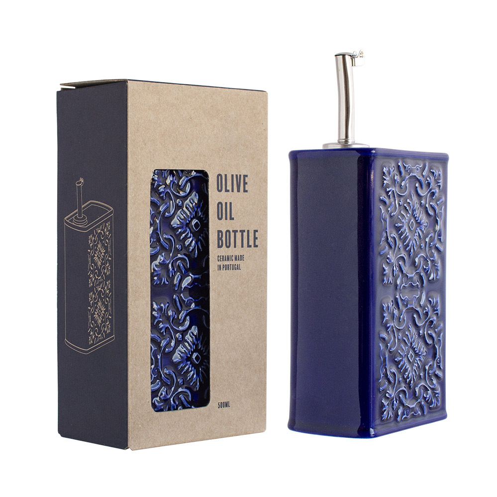 Set consisting of a 500ml olive oil bottle with stainless steel dispenser and lid, and 2 olive oil plates.