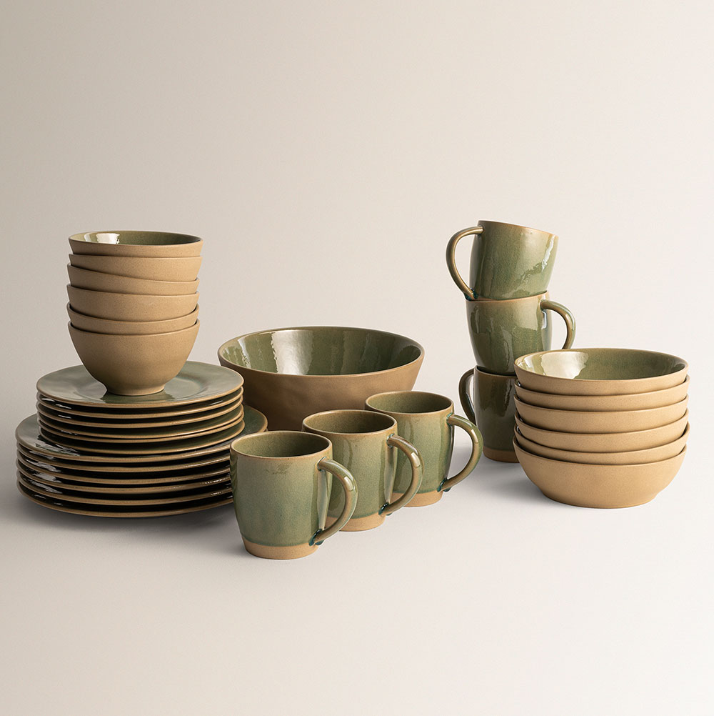DUNA Tableware Set – 32 pieces. Transform your table into a celebration of nature with the DUNA set from Companhia Atlântica. Inspired by the smooth curves of dunes and the serene colors of the Atlantic coast, each piece reveals natural beauty with a unique vintage touch, available in Retro Green, Retro Grey, Warm Grey, and White glazes.