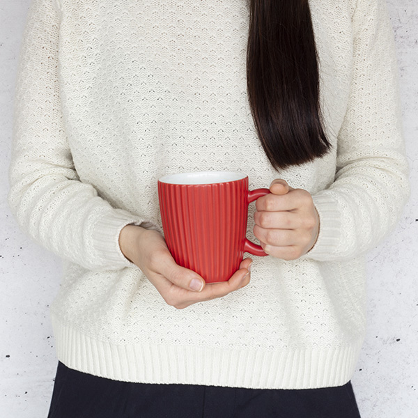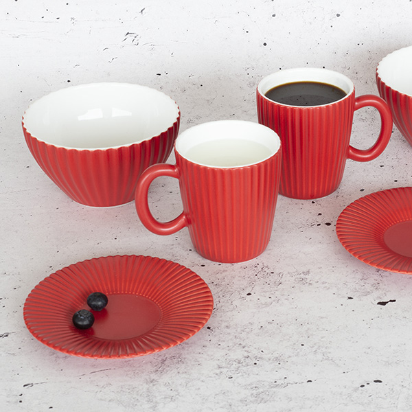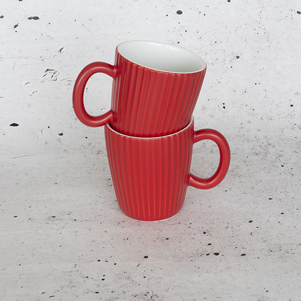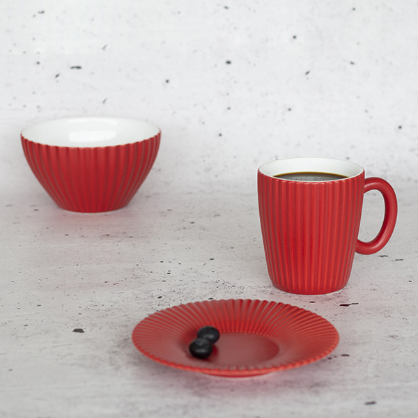 Juego de 6 tazas de café (35cl) decorada a mano con interior blanco y exterior rojo. Diseño inspirado en los relieves de la pala gigante “Plantoir” de Claes Oldenburg & Coosje van Bruggen. Resistente a los impactos y apto para microondas y lavavajillas. Hecho en Portugal.