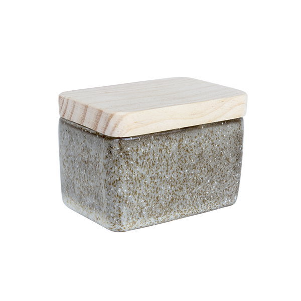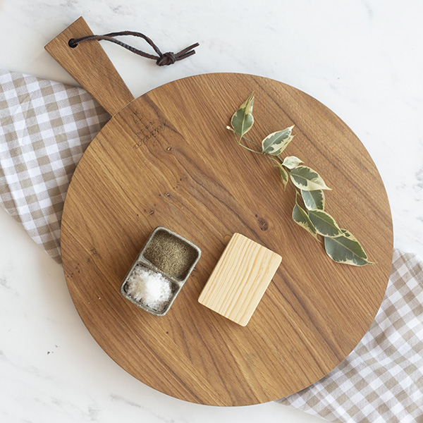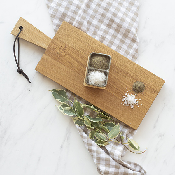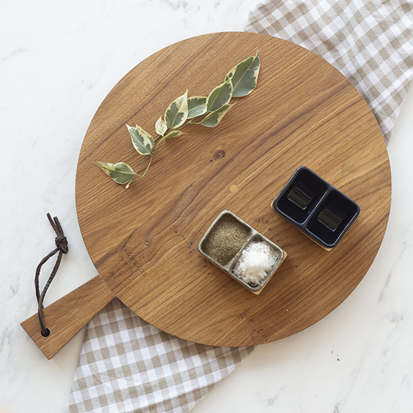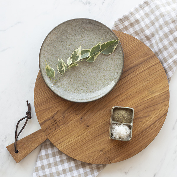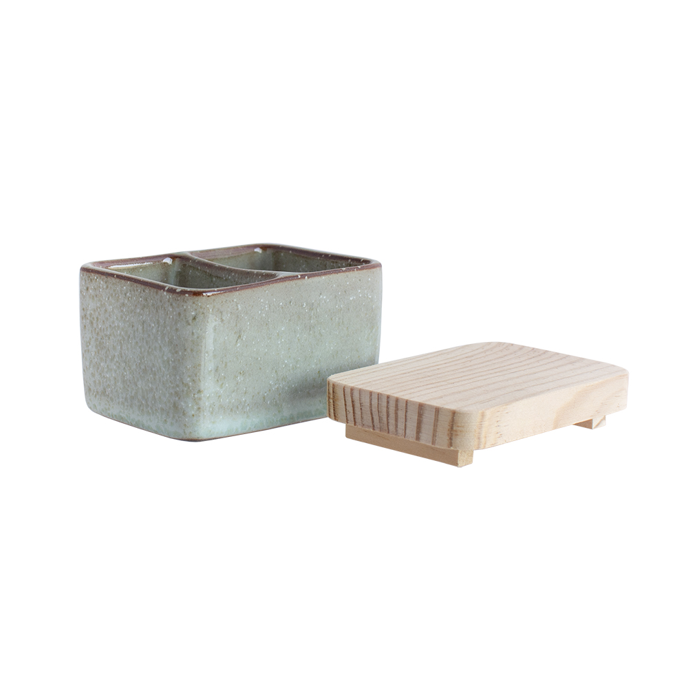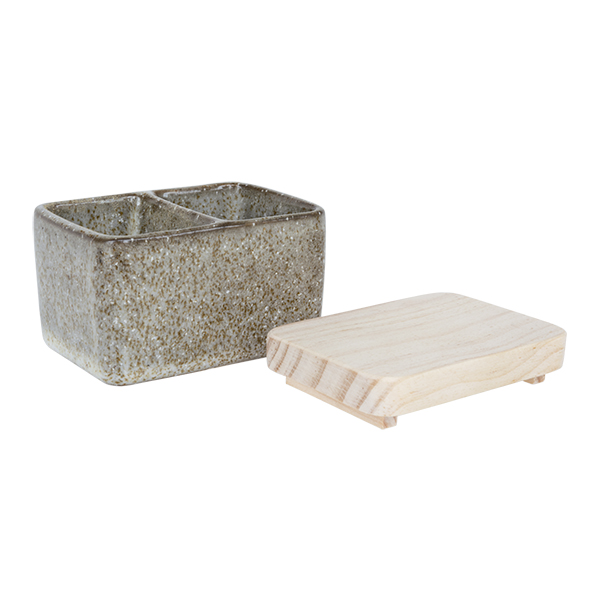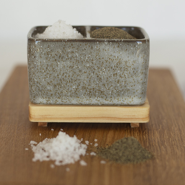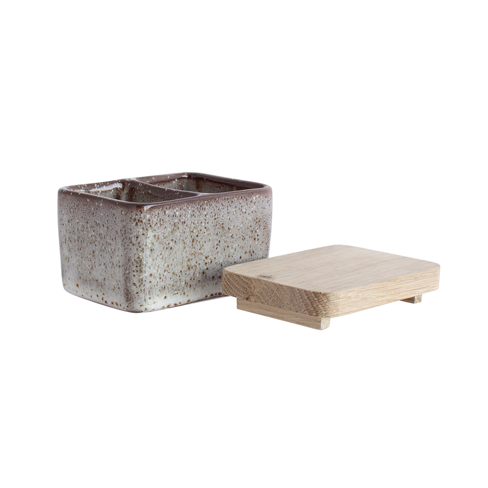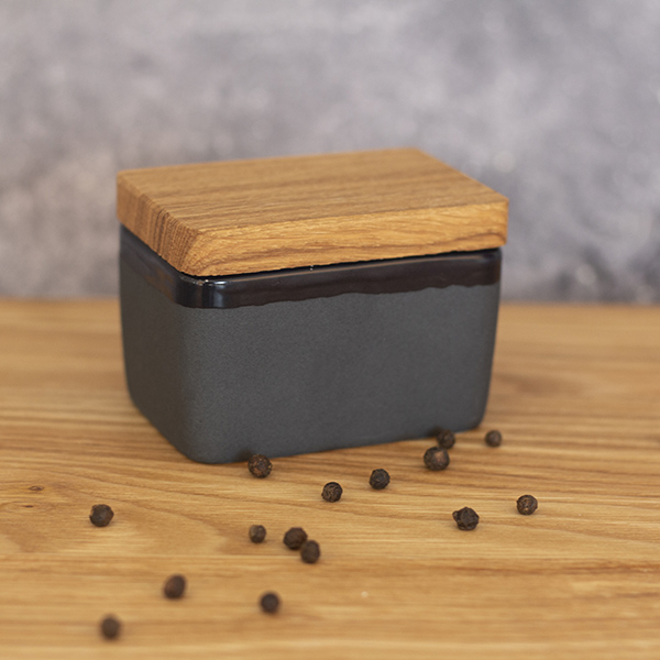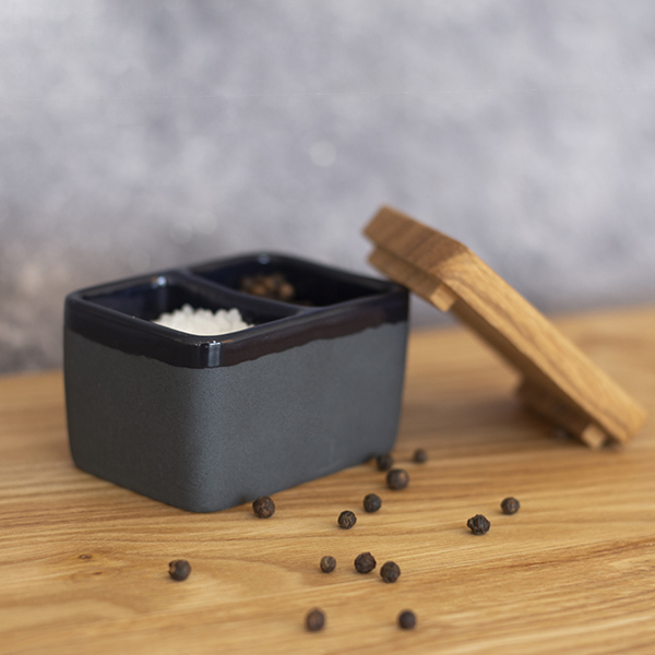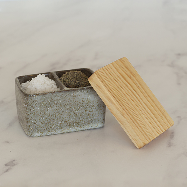 Salière et poivrière en céramique de couleur marron avec couvercle en bois de pin naturel.