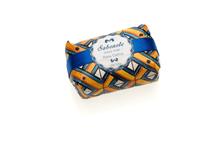 Savon ovale à base végétale au parfum doux et délicat de Rosa Galica, avec détail de ruban de satin.