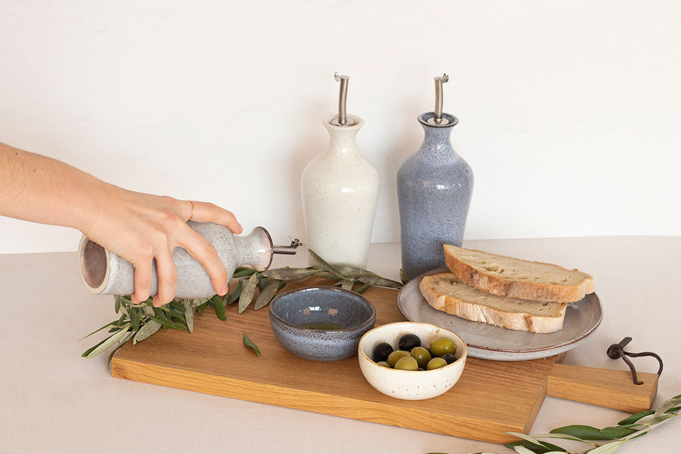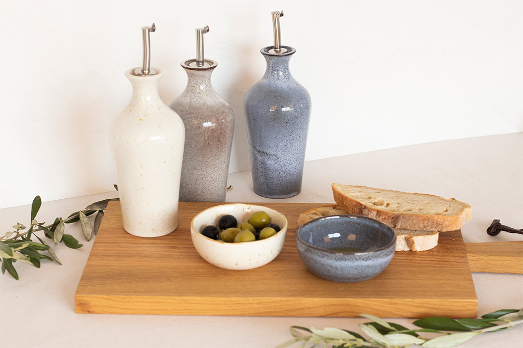 Conjunto composto por Garrafa de azeite, com dispensador em inox c/ tampa e Tigela de 10cm. Fabricados em cerâmica grés, acabamento à mão com vidrado reativo, confere individualidade a cada peça. Feito em Portugal.