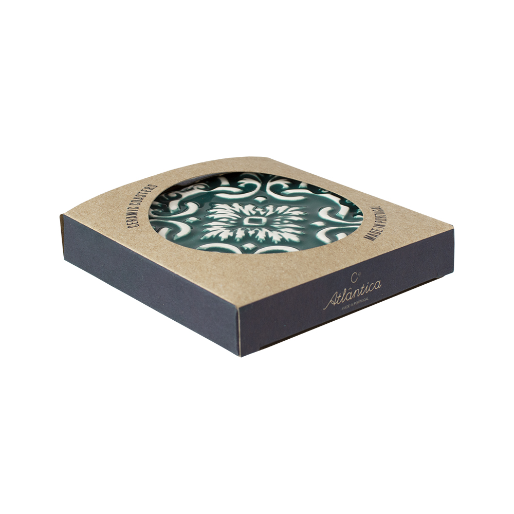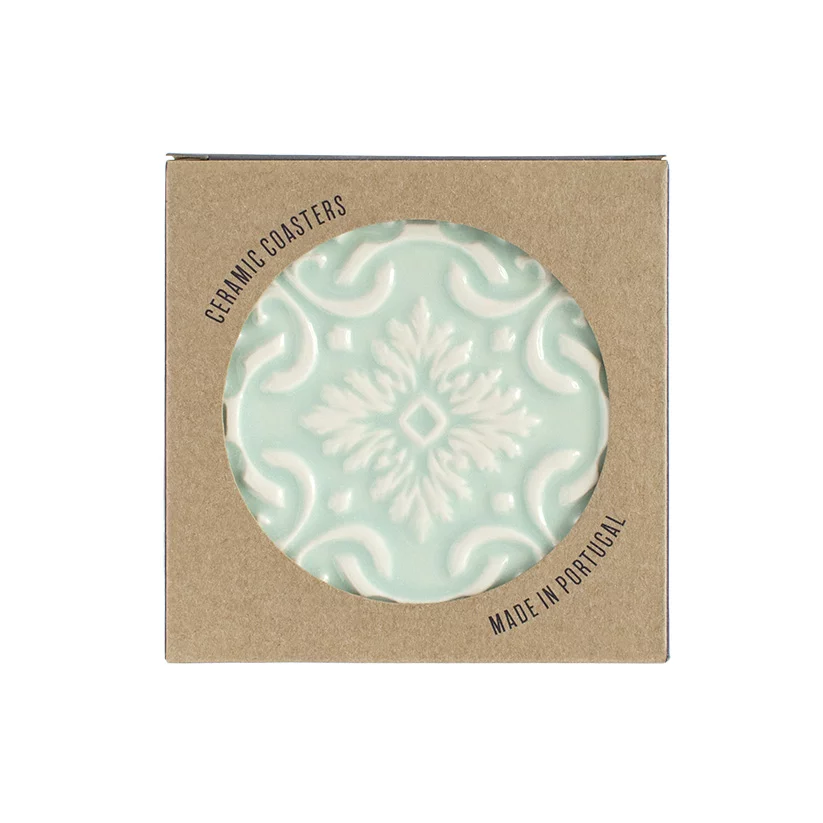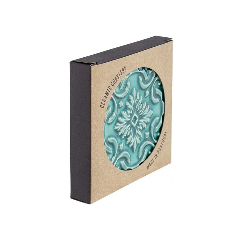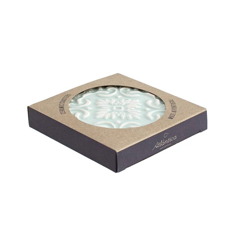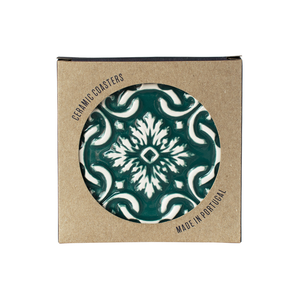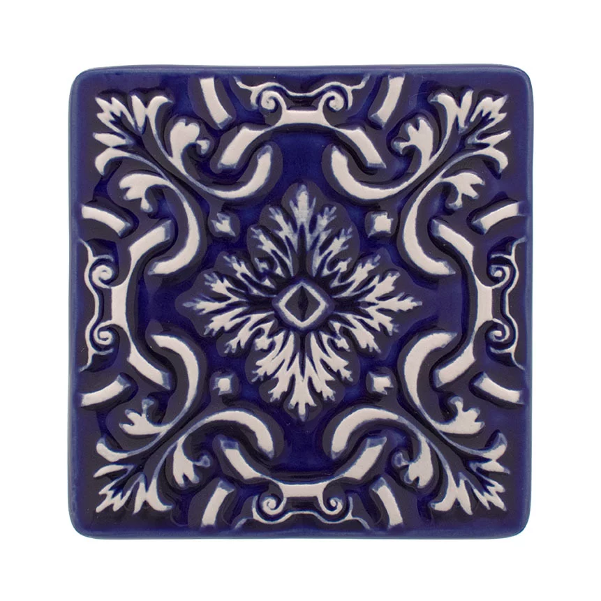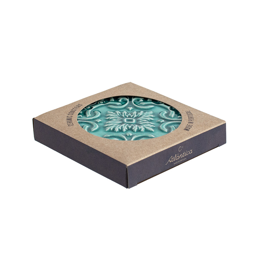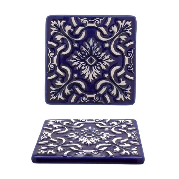 Para além do relevo, inspirados no azulejo português, estas bases de copos têm um acabamento à mão em vidrado reativo.