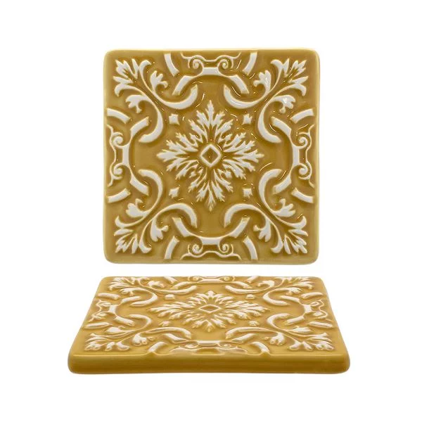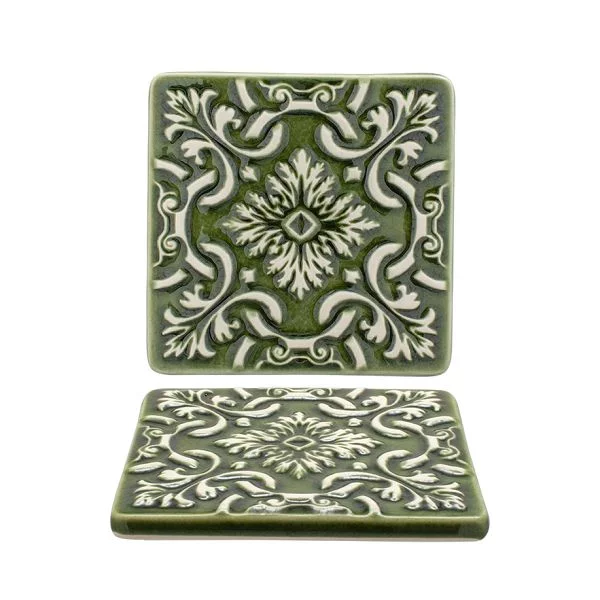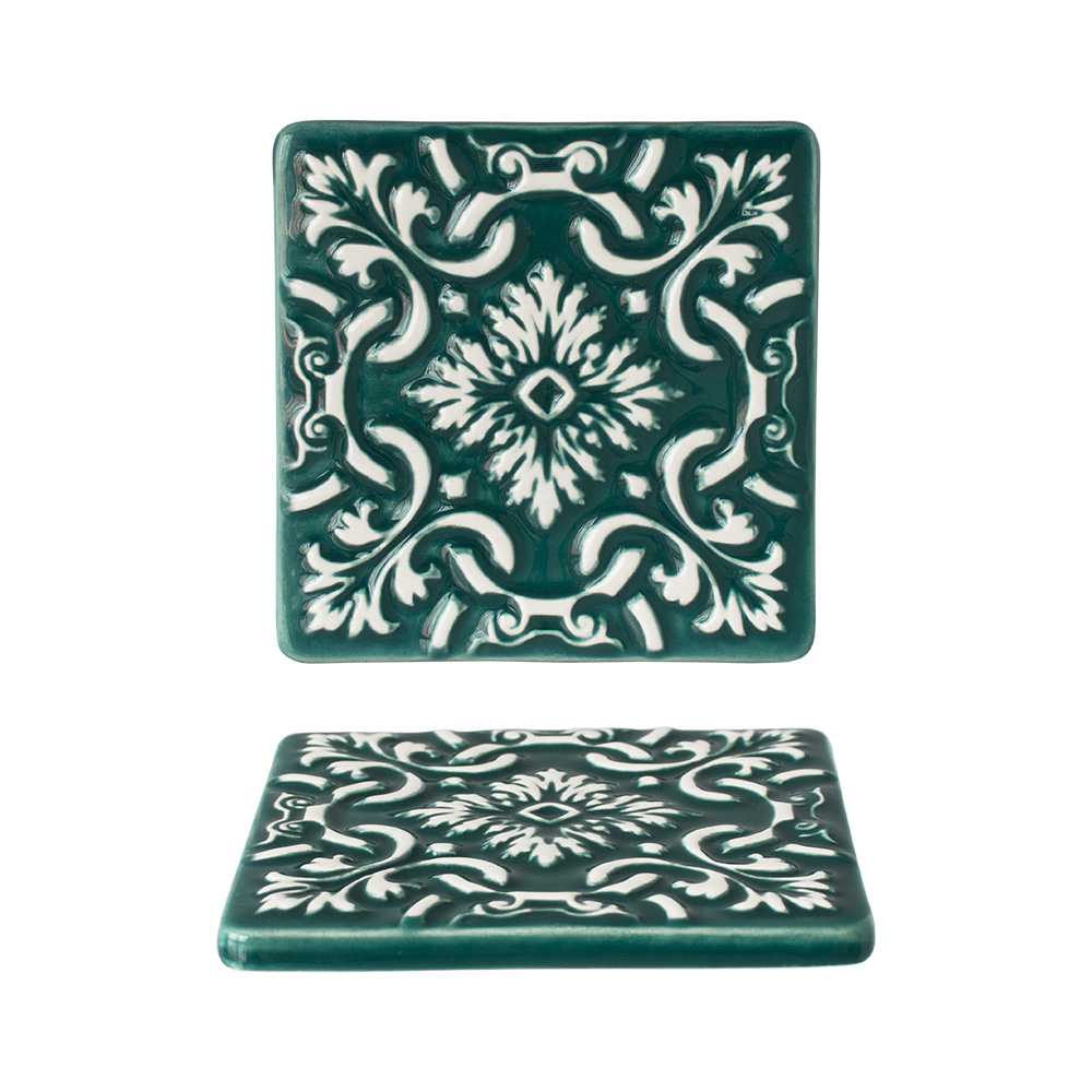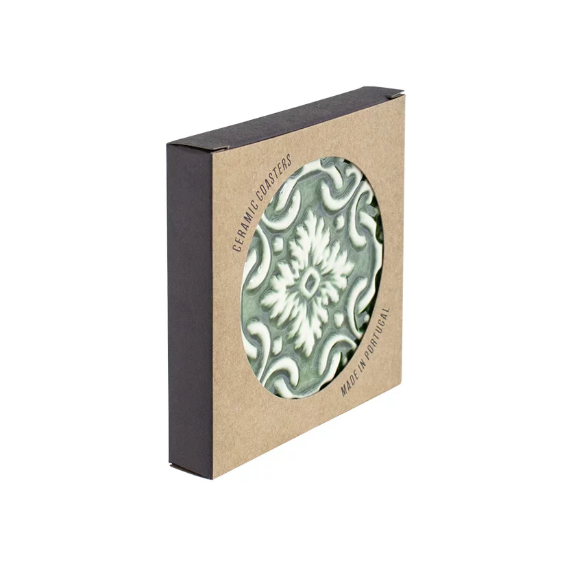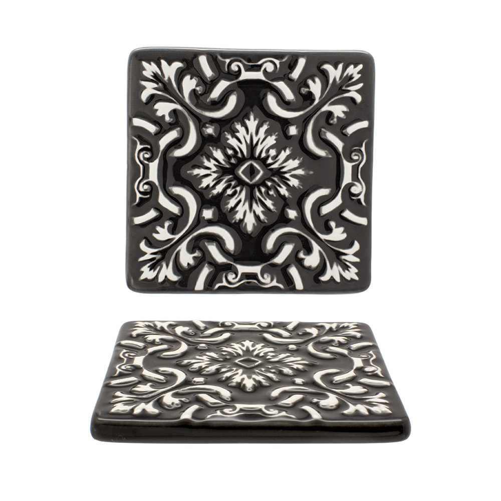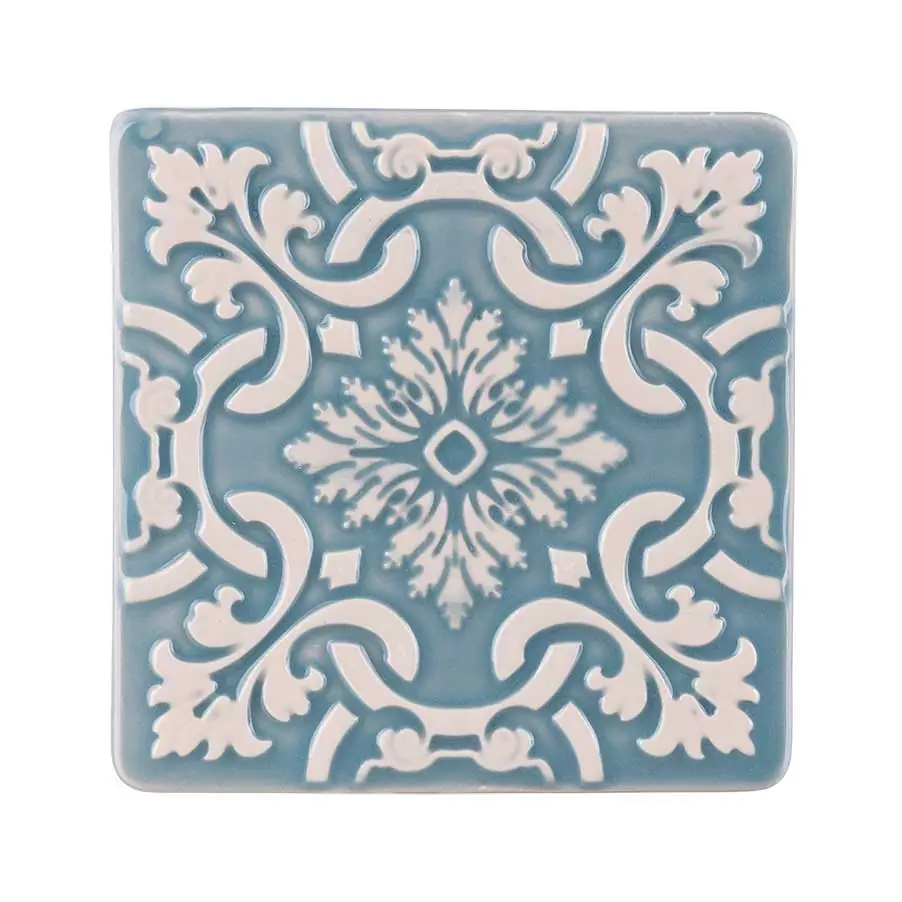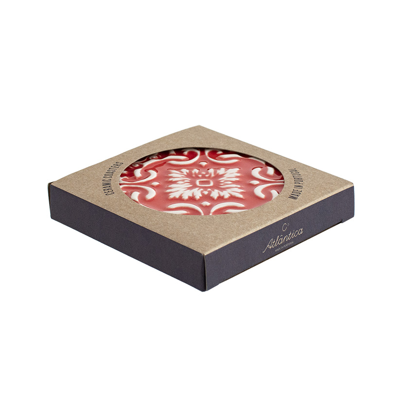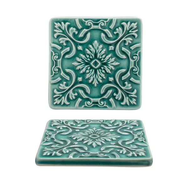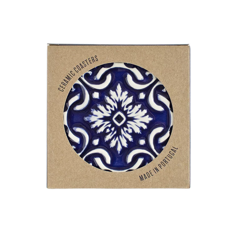 Para além do relevo, inspirados no azulejo português, estas bases de copos têm um acabamento à mão em vidrado reativo.
