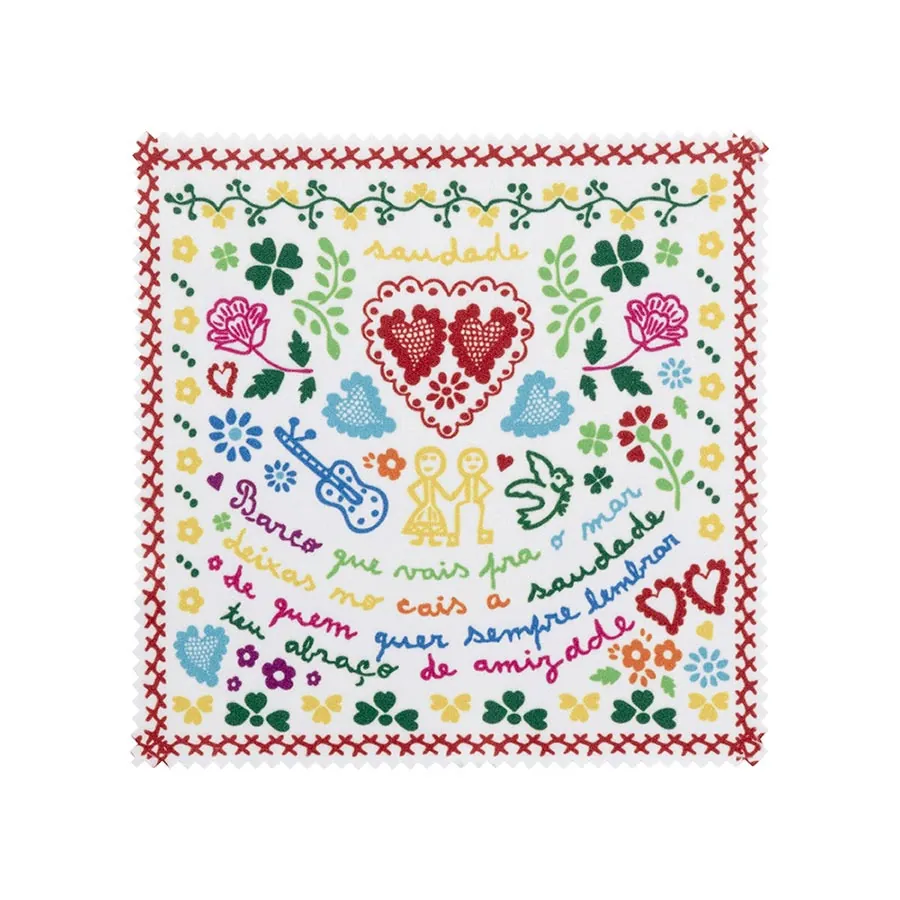 Cada detalhe é uma homenagem à rica herança cultural de Portugal, capturando a beleza e a história do lenço dos namorados composto por quadras, desenhos e símbolos, bordados de vários motivos e cores.